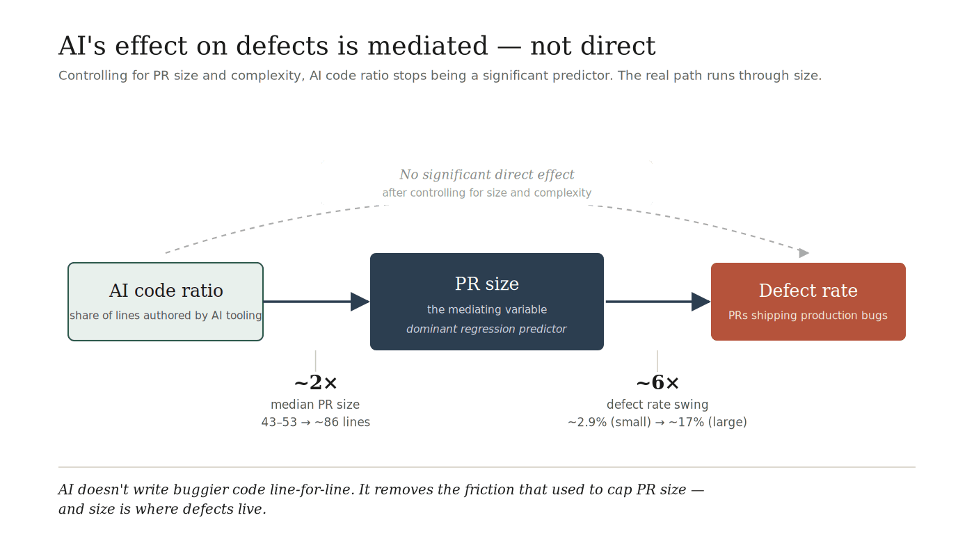This reframes the entire AI quality debate. The question "does AI write buggier code?" presumes a direct effect that the data doesn't support. The better question is: "does AI change the shape of the work in ways that make defects more likely?" And the answer is yes — through size.