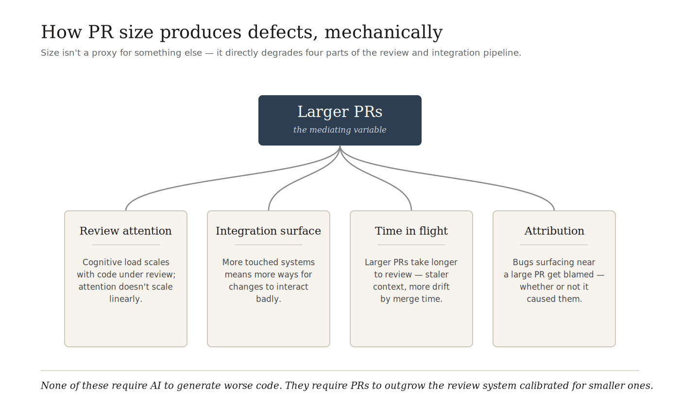 The cohort piece described what disciplined teams do. This one explains why that discipline matters in the first place. PR size isn't one factor among many — it's the mechanism through which AI touches defect rate at all, for any team, in any cohort.