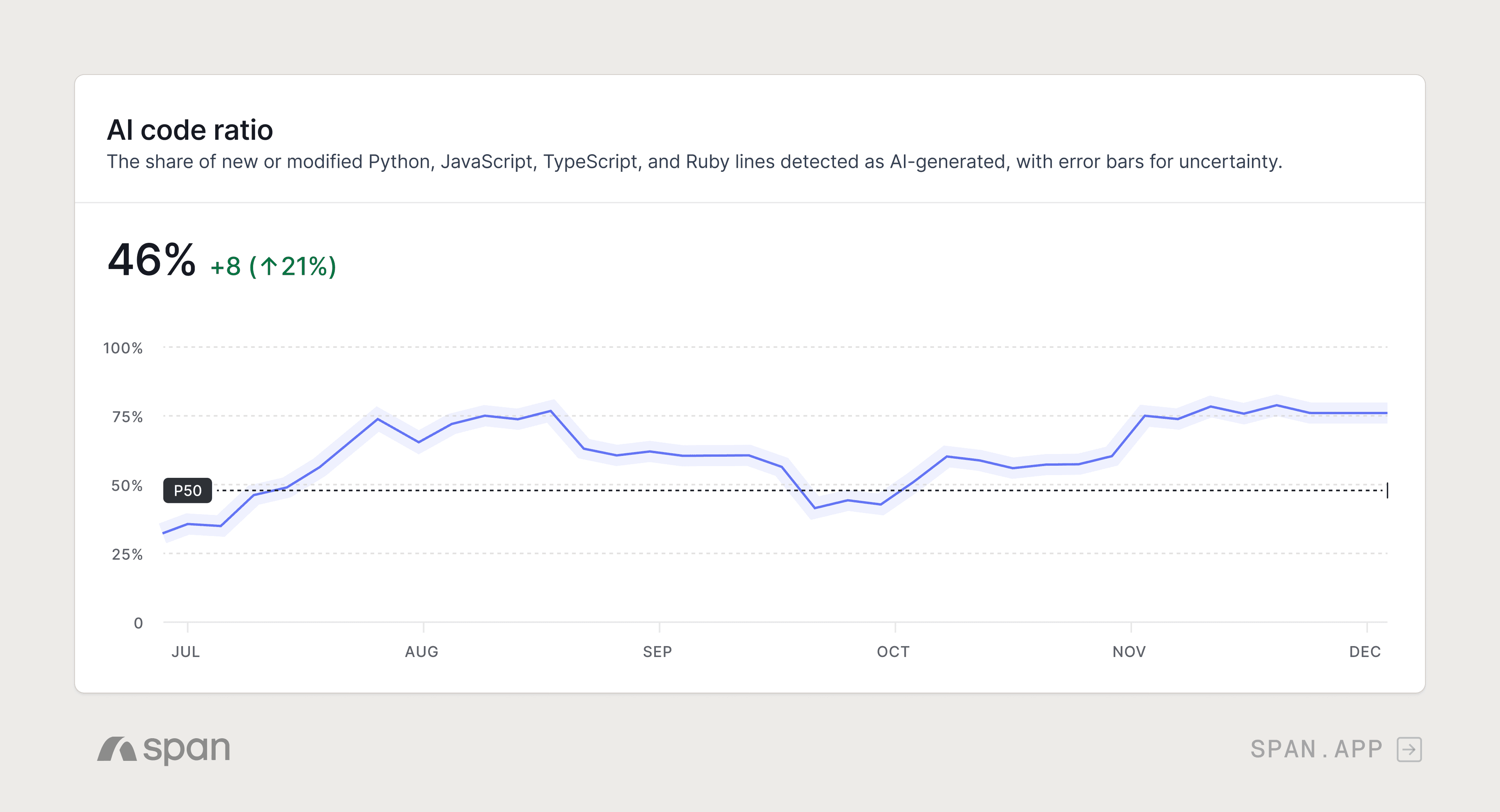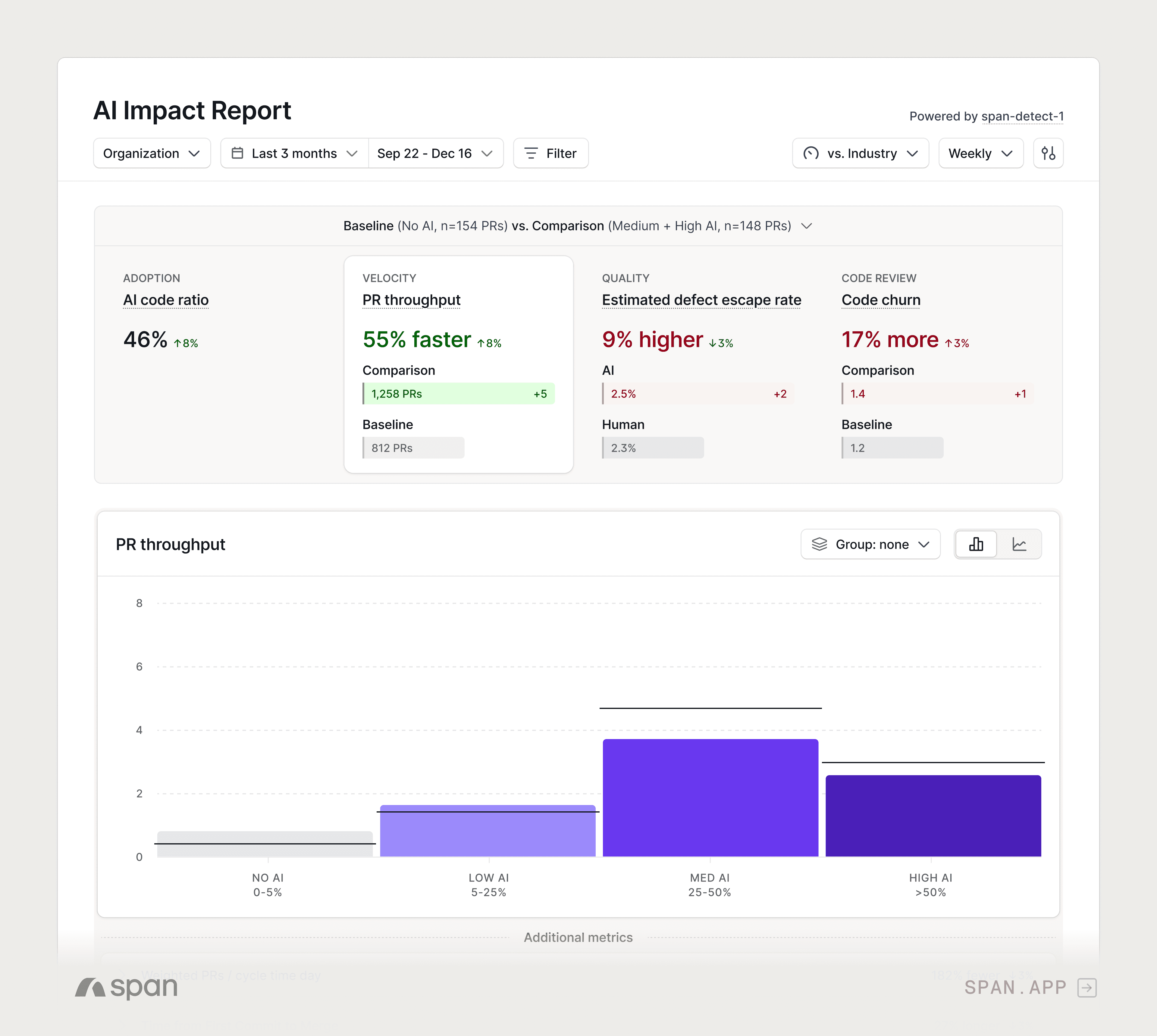 This builds on the foundation we laid in September with our AI code detection model, span-detect-1, which made Span the only platform measuring AI code in production with 95% accuracy across all AI tools. Measurement was just the start. The AI Impact Report connects that signal directly to the outcomes leaders care about.
