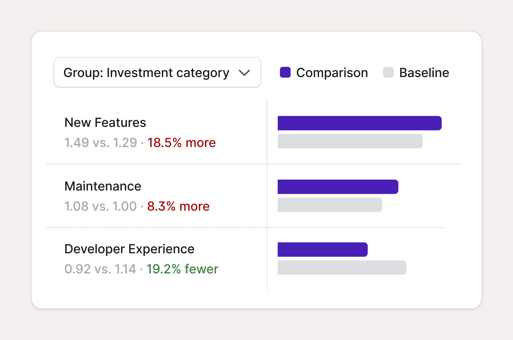 See how AI changes velocity and throughput. Compare delivery across different levels of AI usage.